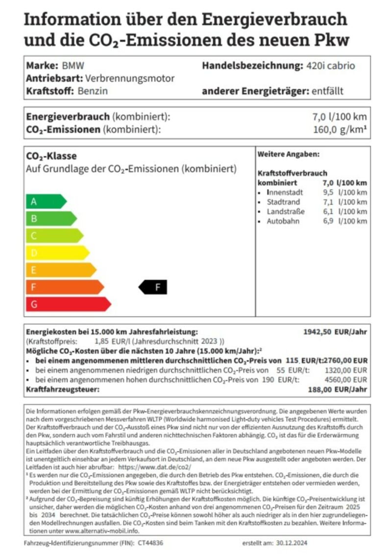 Information über den Energieverbrauch und die CO2-Emissionen des neuen PKW