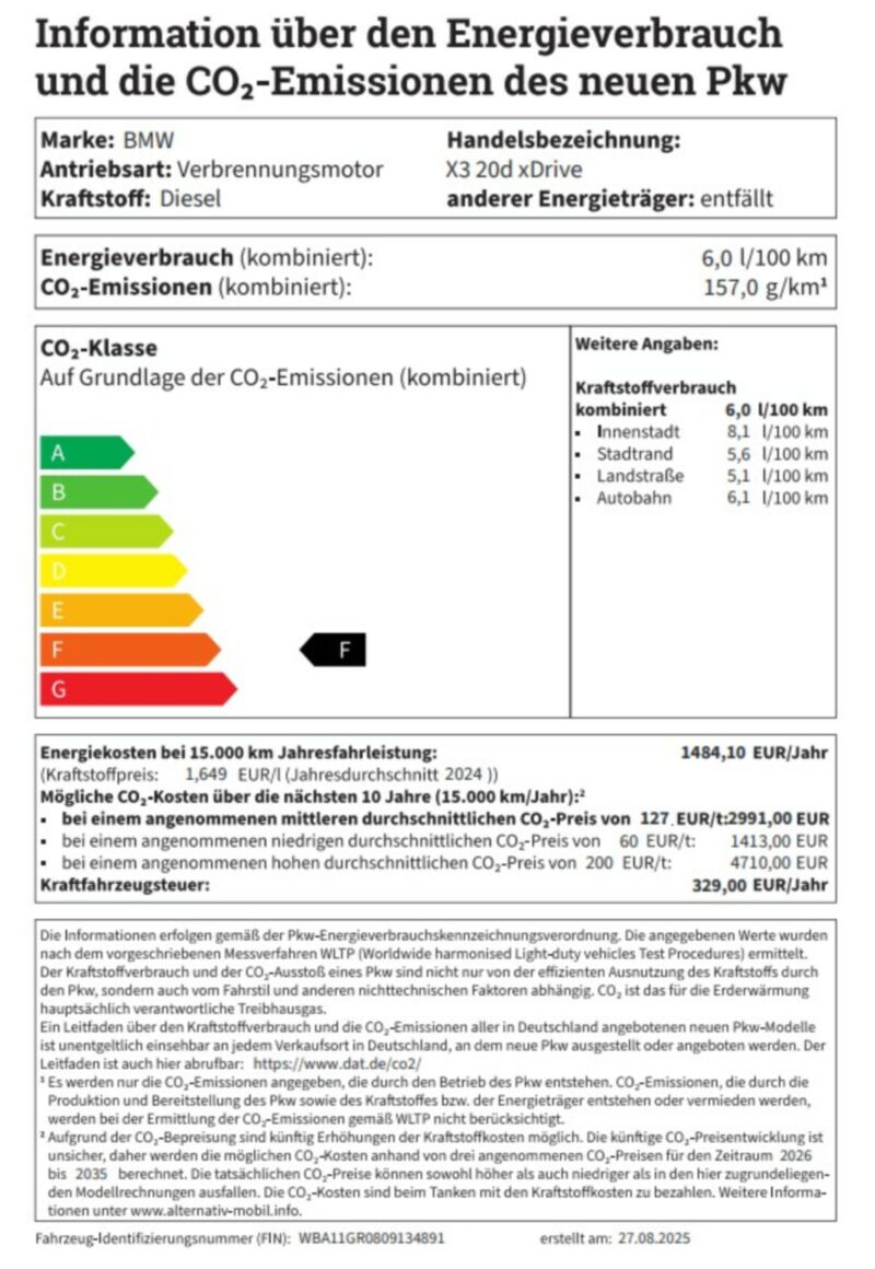 Information über den Energieverbrauch und die CO2-Emissionen des neuen PKW