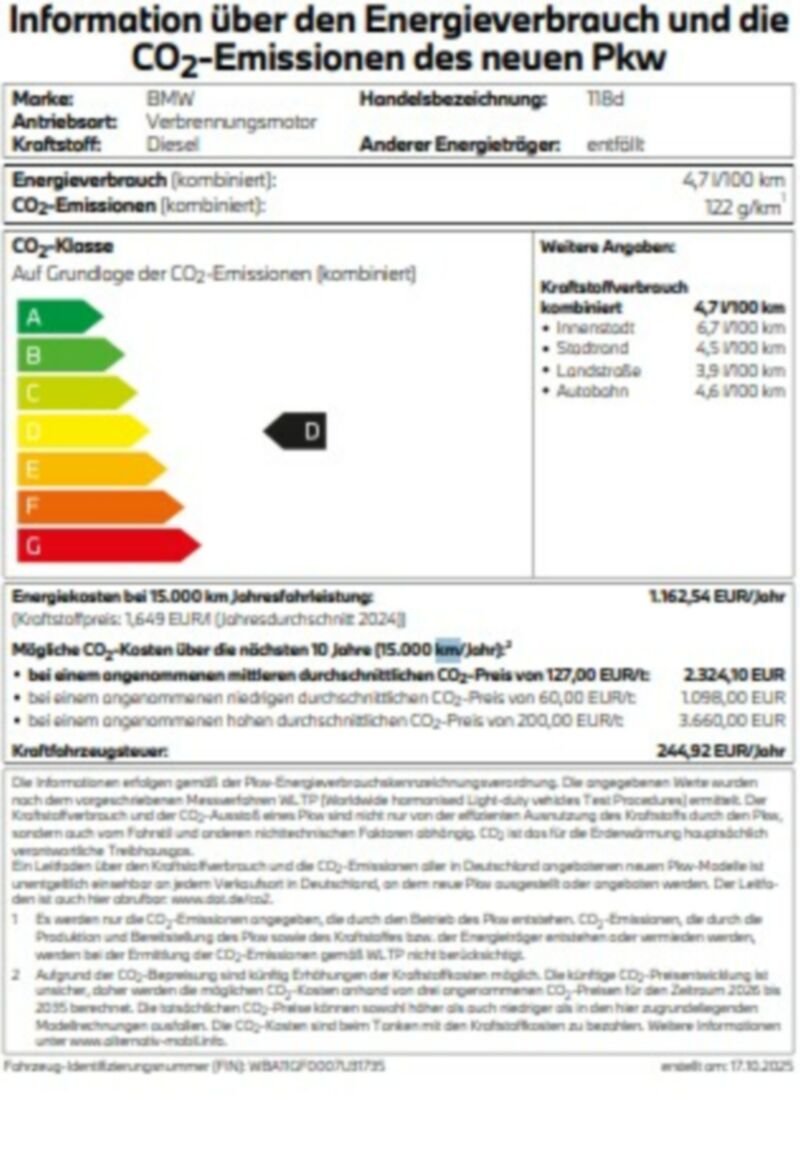 Information über den Energieverbrauch und die CO2-Emissionen des neuen PKW